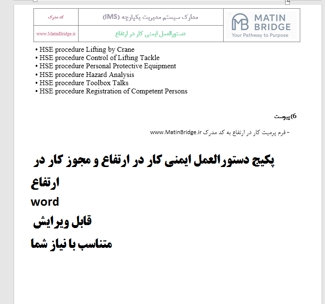 این بسته شامل یک دستورالعمل کامل و بومیشده برای کار در ارتفاع و یک فرم پرمیت استاندارد است که بهصورت آماده برای اجرا در سازمانها و پیمانکاریها تدوین شده است. مولف: دکتر محسن مظاهری — جهت دریافت و پشتیبانی: www.MatinBridge.ir