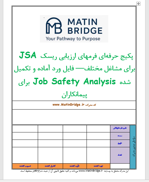 پکیج حرفهای فرمهای ارزیابی ریسک JSA برای مشاغل مختلف— فایل ورد آماده و تکمیل شده Job Safety Analysis شامل شیتهای امور اداری، کنترل کیفیت، خدماتی، نصب استراکچر، جوشکاری، راننده جرثقیل، سنگزنی، آرماتوربندی، اپراتور کمپرسور و غیره.
